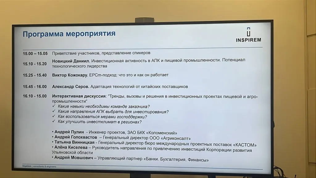 +7 (812) 712-50-1430 сентября 2025 года в рамках деловой программы 30-й международной выставки «Агропродмаш-2025» в Москве состоялась конференция «Сопровождение инвестиционных проектов в пищевой промышленности и сельском хозяйстве», организованная ООО «Инспайрем Рус» https://inspirem.ru/